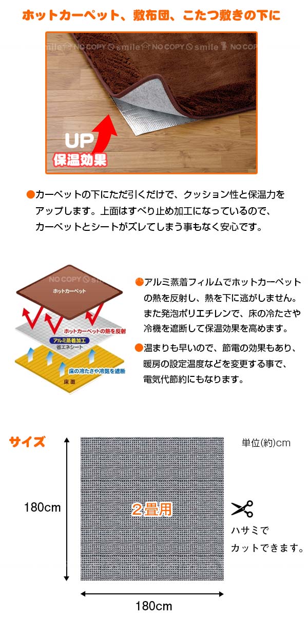 ホットカーペットや敷き布団、こたつ敷きの下等に! 熱反射性のあるアルミ蒸着フィルム(表面)で熱を下に逃がさず、断熱効果のある発泡ポリエチレン層(裏面)で床からの冷気を防ぎ、保温力をアップさせます。