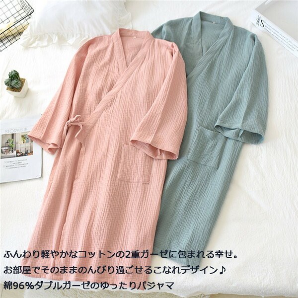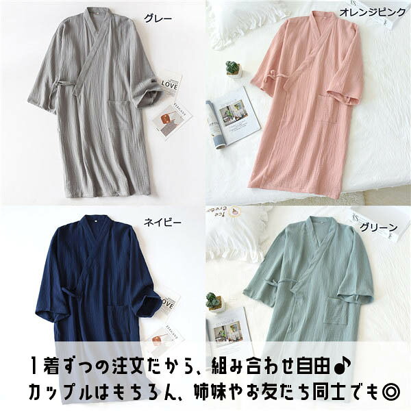 ルームウェア パジャマ 無地 ルームウェア しわ加工 レディース メンズ コットン バスローブ 浴衣 お風呂上がり カップル お家時間 部屋着 寝間着 しわ加工 お揃い 大人 前開き 長袖 オレンジピンク ネイビー グリーン グレー dh081c0c0g5