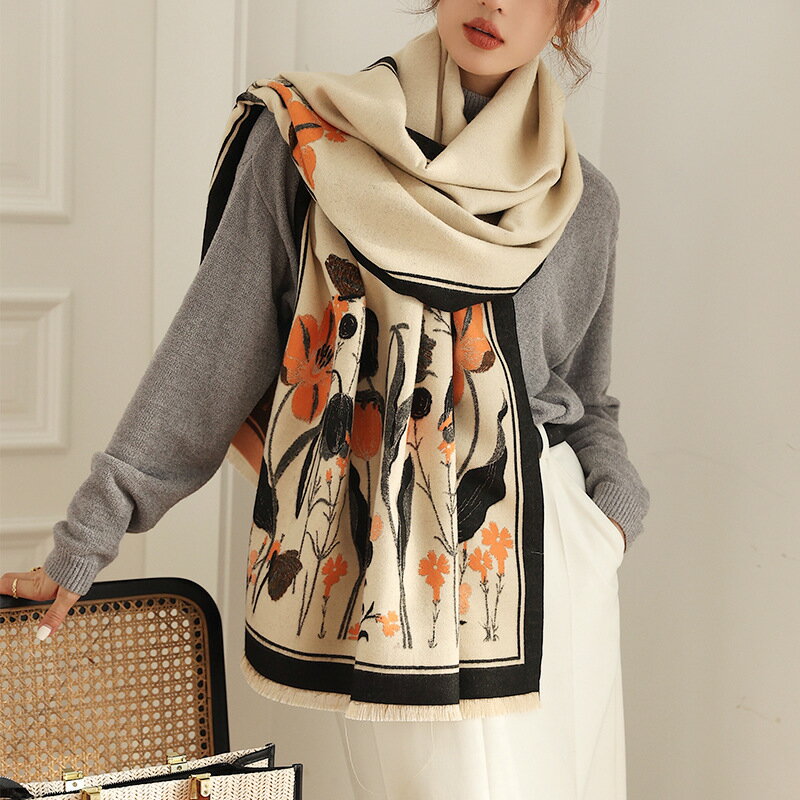 十分な幅と長さがあり、ぐるぐるっと首に巻くのはもちろん、肩に掛けてエレガントにショール使いもオススメ。