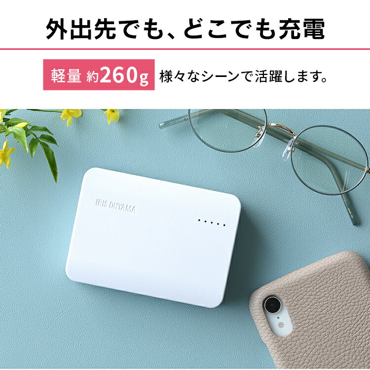 ●対応機種iPhoneおよびUSB端子で充電するスマートフォンやタブレットなどの小型電子機器※ご使用の際は使用する機器の取扱説明書をお読みになってからご使用ください※USB-A-micro-Bケーブル以外は同梱しておりません●定格入力DC5V/2A●定格出力DC5V/2.4A●電池リチウムイオン電池 3.6V 3350mAh×3●使用温度0〜40℃●商品サイズ(cm)幅約7.3×奥行約2.6×高さ約10●商品質量約260g●付属品USB-A-micro-Bケーブル(約12cm)●カラー/型番ブラック/IPB-A1001-B、ホワイト/IPB-A1001-W届出事業者名:アイリスオーヤマ株式会社 PSマークの種類:PSE (検索用:モバイル バッテリー 充電 スマホ充電 携帯 低電流モード LUCA 大容量 スマートフォン タブレット iPhone対応 Android対応 防災 停電対策 4967576526333 4967576526340)