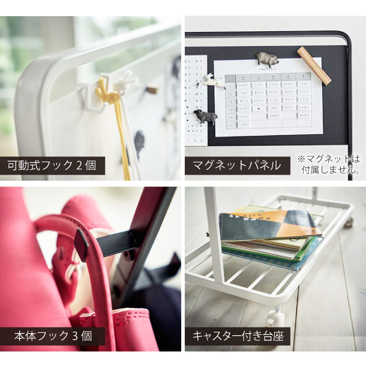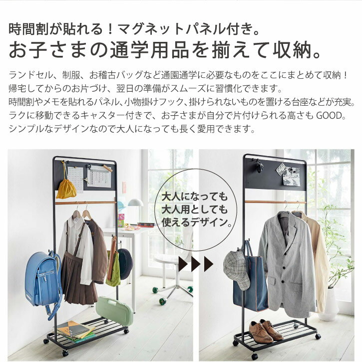 パネルには時間割やメモなどを貼り付けられて、通園・通学に必要なものを揃えて収納できるハンガーラックです。