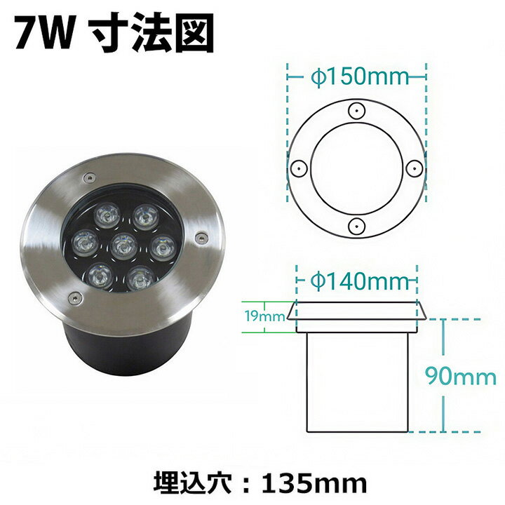【仕様】消費電力:7W色温度(発光色):電球色 2700K / 昼光色 7000K演色性:>85全光束:770lm発光角度:30°防塵・防水等級:IP67環境使用温度:-20〜60度材質:ステンレス定格電圧:85-265VAC定格寿命:40000時間保証期間:1年調光器(対応/非対応):非対応LEDチップ:Bridgelux本体サイズ(約):D150mm * H90mm / 埋込穴 φ135mm本体重量(約):950g電源ケーブル:先バラ L…茶 / N…青 / アース…緑▼ 関連商品はこちら ▼ >>単品販売のページを見る >>4個セットのページをみる ★