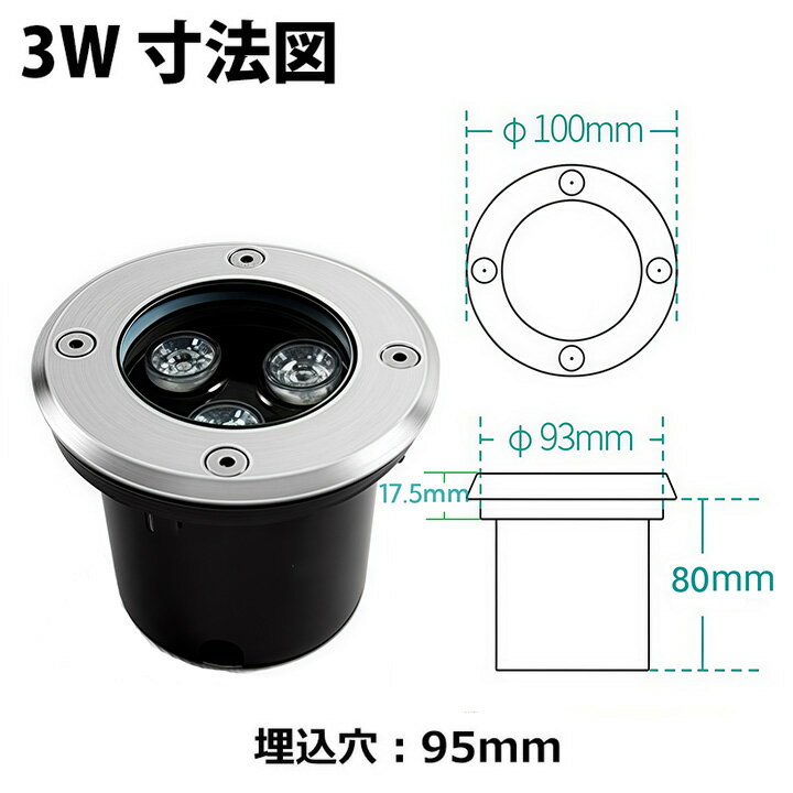 【仕様】消費電力:3W色温度(発光色):電球色 2700K / 昼光色 7000K演色性:>85全光束:330lm発光角度:30°防塵・防水等級:IP67環境使用温度:-20〜60度材質:ステンレス定格電圧:85-265VAC定格寿命:40000時間保証期間:1年調光器(対応/非対応):非対応LEDチップ:Bridgelux本体サイズ(約):D100mm * H80mm / 埋込穴 φ95mm本体重量(約):400g電源ケーブル:先バラ L…茶 / N…青 / アース…緑▼ 関連商品はこちら ▼ >>単品販売のページを見る ★