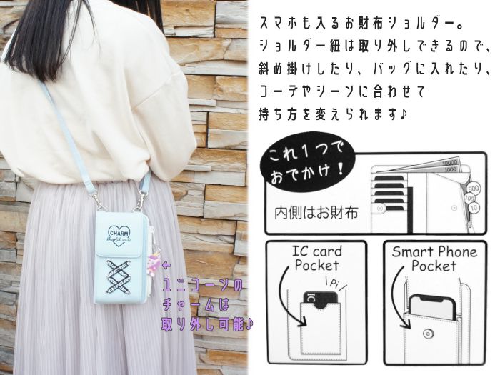 =====お財布ショルダー 小学生 中学 女の子 財布 スマホ入る ミニバッグ オシャレ 小さめ お出かけ 合皮 女子 中学生 小学生 高校生 大学生 小学2年 3年 4年 5年 6年 大人っぽ スマホ収納 縦型 お財布 ポシェット バッグ ミニショルダー ショルダー ミニ キッズ 子供用 レディース 多機能ショルダー お財布機能 肩掛け ウォレット 旅行 オルチャン風 ハート ロゴ ユニコーン チャーム付き かわいい スポーティ カジュアル 合成皮革 プレゼント お祝い お誕生日 進級 進学 スマホ収納 スマホ収納型財布 スマホポシェット スマホショルダー スマホポケット ライトブルー パープル ブラック 水色 紫 黒 ゆめかわ 素材合成皮革 サイズ(約)タテ17cm×ヨコ10cm その他仕様■お財布部分:・スナップボタン開閉・札入れあり・小銭入れ:ファスナー開閉・カードポケット×5・背面にカードポケットあり■ショルダー紐:・調節、取り外し可能・(約)63cm〜117cm■ユニコーンのチャームは取り外し可能 カラー展開【Lブルー】3,850 円(税込)在庫:○【パープル】3,850 円(税込)在庫:○【ブラック】3,850 円(税込)在庫:なし